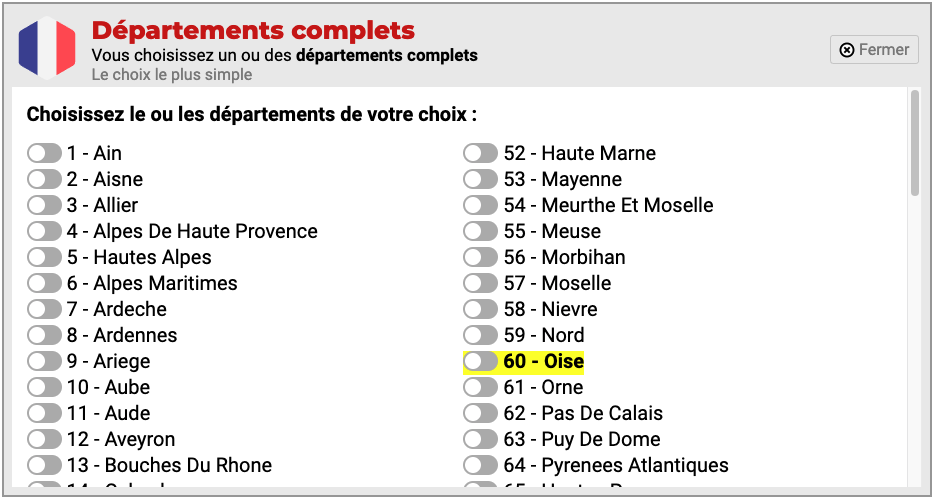 Pour la France uniquement, vous pouvez aussi opter pour la simplicité en choisissant simplement un ou plusieurs départements complets.